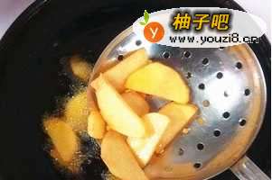 3炒锅上火,烧热油约七成热时,下入土豆块炸至微焦黄熟透捞出,再下入茄子炸透捞出,青椒炸十秒捞出。