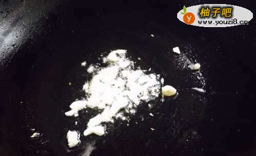 4接下来再倒适量油,油热了把蒜末倒进去煸香,香味出来之后把沥干水分的苦瓜倒进去翻炒30秒左右。