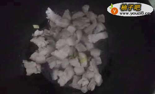 5将洗净的五花肉倒入锅中,翻炒至七分熟,注意控制好火候和翻炒时间,勿将肉炒过了以免影响口感;