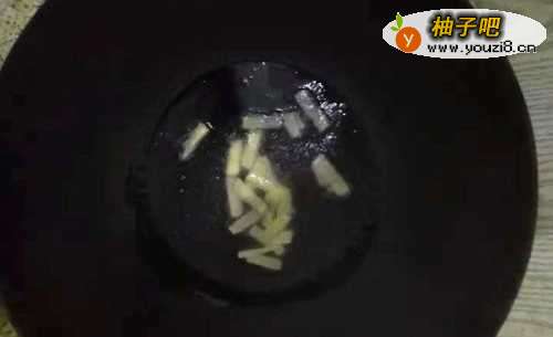 4将炒锅洗净烘干,倒入少许食用油,等油热后将姜丝放入锅中,将油炒香,也可加入少许花椒、茴香等料;