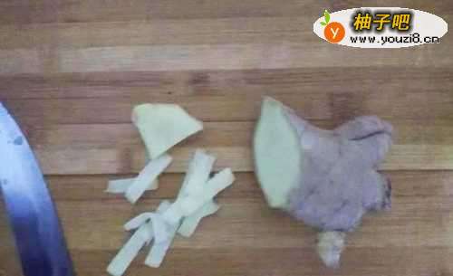 2取生姜切下一个薄片,将薄片周遭的陈皮用刀小心剥除,然后将姜片切丝,或切些葱丝来代替也可;
