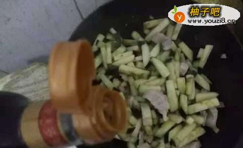 6接下来将茄条倒进锅中翻炒几次,倒入少许酱油来上色,不喜欢用酱油的话可加入少许食盐,注意向锅中加入少许水以免粘锅;