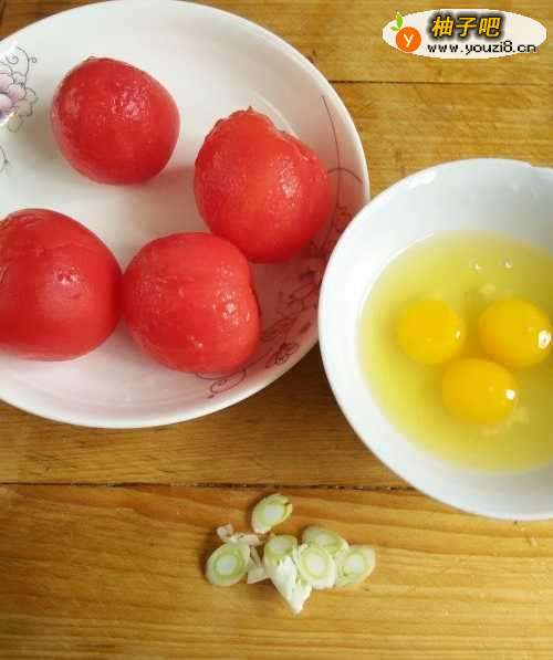 2将水果西红柿去掉皮,鸡蛋打入碗中,葱切成丝。再将水果西红柿切成片。