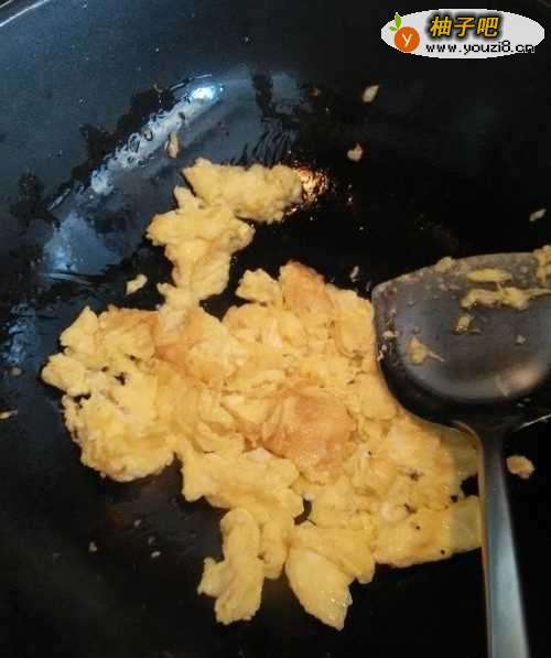 4用铲子将鸡蛋搅拌成均匀的小块,炒熟后,盛入碗中。