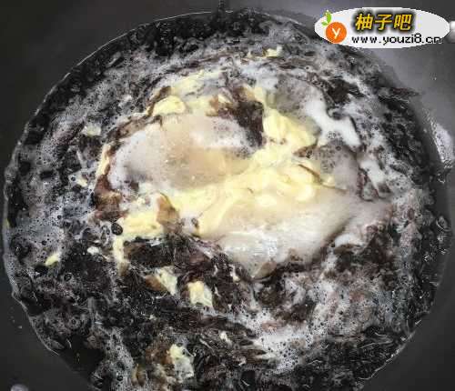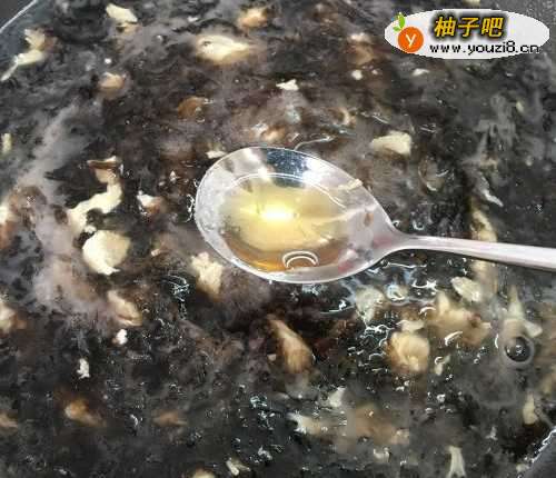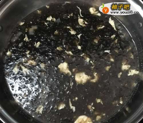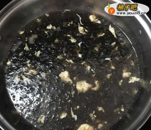 4然后将鸡蛋液倒入,再把水淀粉倒入,和紫菜一起搅拌均匀。
