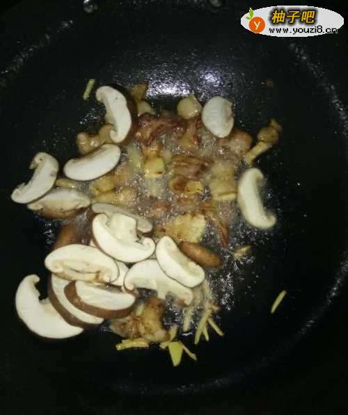 3将鲜香菇下锅里炒香,再加入适量的水,盖上锅盖煮5-10分钟,煮到熟;