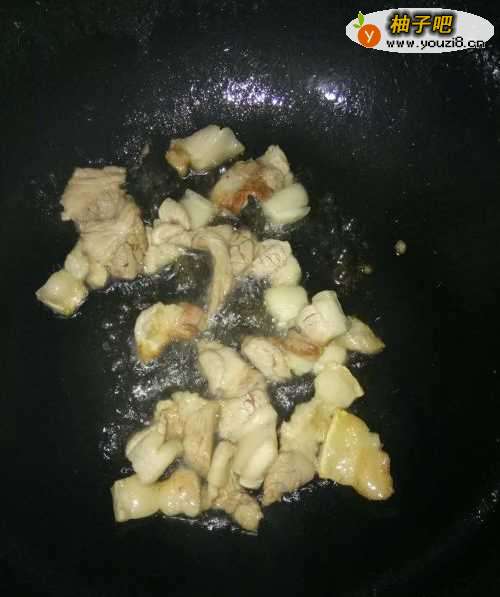 2将五花肉先洗干净,切小块,下入锅里炒出油,再 下蒜头一起炒香;