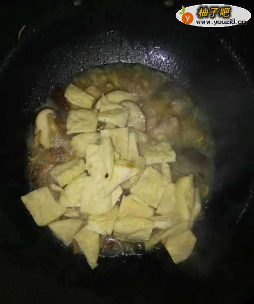 4将油豆腐下入锅里,翻搅均匀,煮5-8分钟,煮到烂烂的、比较好吃;