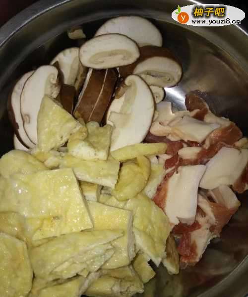 将原材料清洗干净,切好,准备好;油豆腐和香菇、尖椒都切小块;蒜头去膜,切碎;