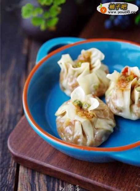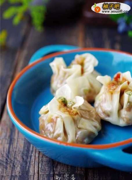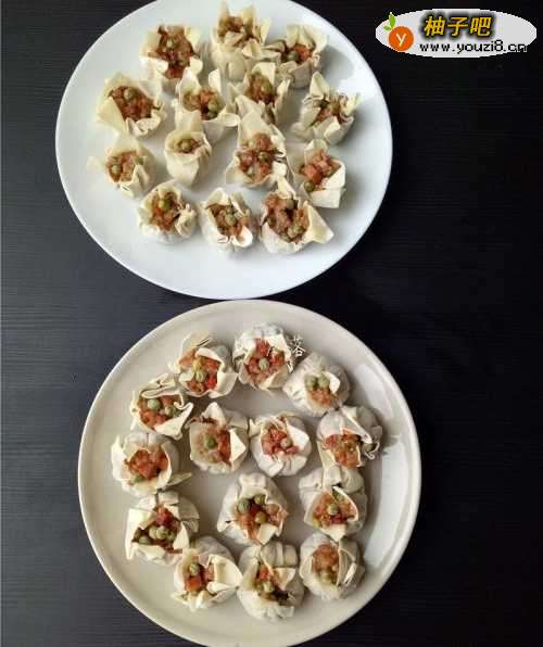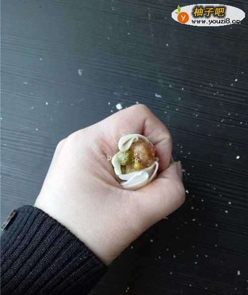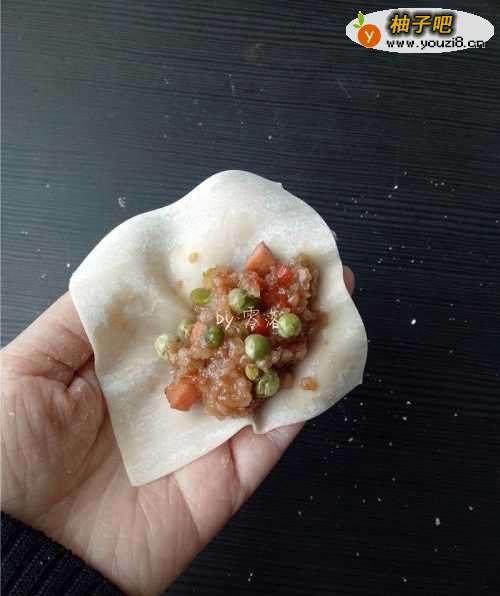9将抄手皮放在掌心,放入适量烧卖馅;