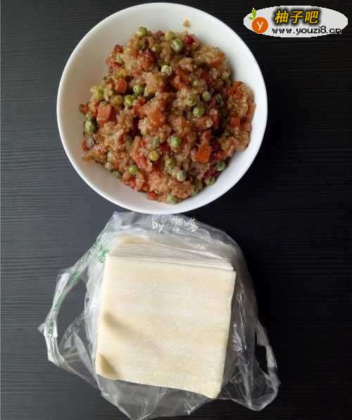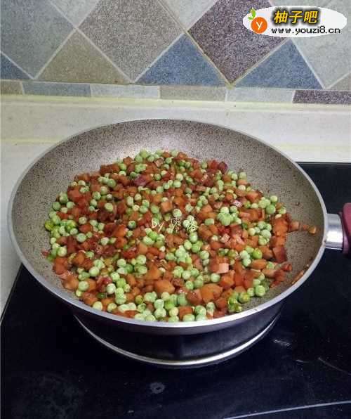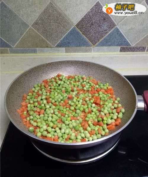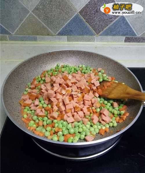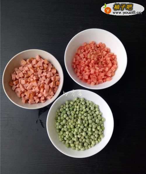2豌豆剥粒洗净;胡萝卜去皮洗净,切丁;火腿切丁;