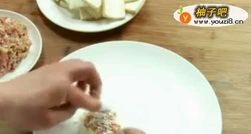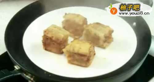33、茄片蘸淀粉,夹上肉馅,铺一片茄子反复铺6-7层,打一个鸡蛋并搅散放入淀粉拌匀,茄子蘸上糊。
