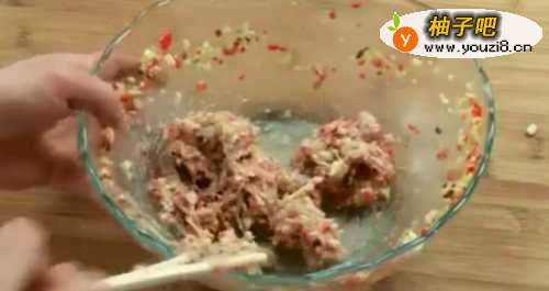 22、碗中放入所有末状食材混在一起,加入盐,鸡粉白胡椒粉,海鲜酱油、香油、料酒打入蛋清搅匀