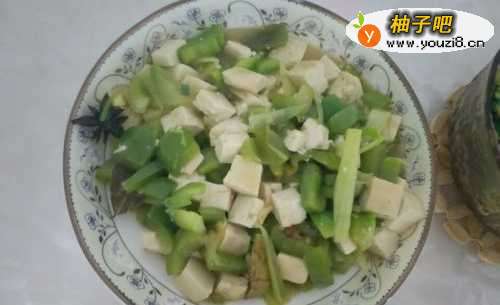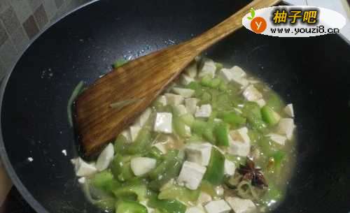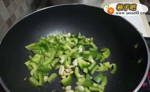 2小火烧热花生油,待油好后放入青椒丁烹炒,再加入葱丝