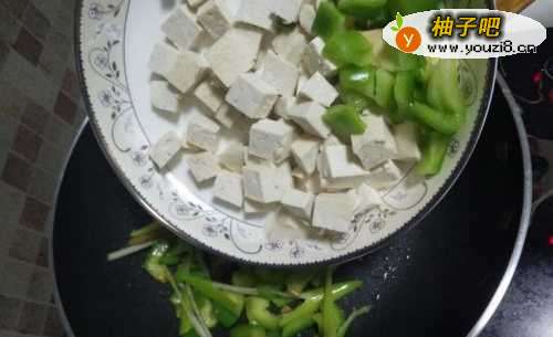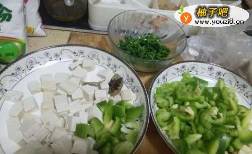 首先是炒菜前的准备工作,将豆腐、青椒、蒜、姜切丁备用,豆腐撒上一些盐腌上
