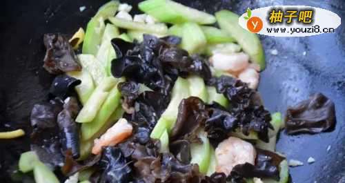 5先将切好的丝瓜下锅,中火翻炒至丝瓜变软出水,加入适量食盐调味,少许五香粉提鲜,最后将黑木耳下锅,淋上一勺高汤或者开水,翻炒均匀即可出锅。