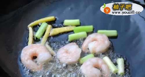 4炒锅中加入少许食用油烧热,加入葱段、姜丝、虾仁稍稍煸炒半分钟,炒出香味。