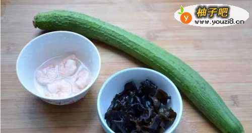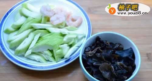 首先准备食材新鲜丝瓜,虾仁几粒常温自然解冻,黑木耳1小把凉水泡发即可。