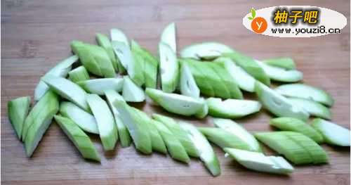 2丝瓜洗净后切去两端,刮掉外皮,中间切开后斜刀切块备用。