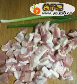 先把肉馅准备好,把五花肉切成小块,葱洗净切小段。
