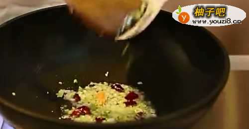 44. 在热锅内下油将干辣椒,葱姜和青蒜爆香。