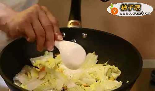 55. 放入白菜和盐,白糖味精,鸡粉,料酒老抽米醋翻炒几下。