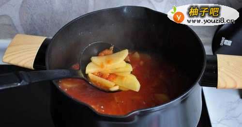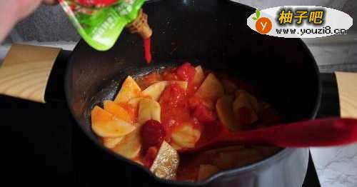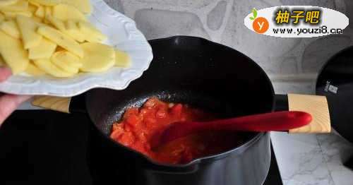 4炒至西红柿起砂浆时,加入土豆一起略翻炒约两分钟