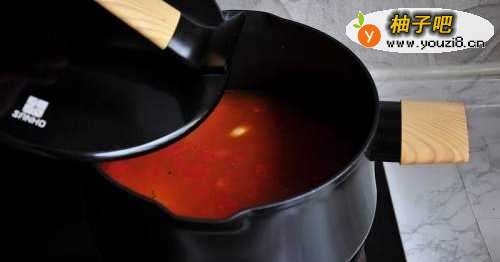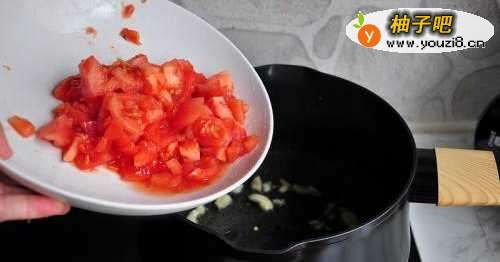 3汤锅中加入适量的油,先将蒜末放入炒香,然后加入西红柿充分翻炒