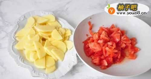 西红柿去皮切成小丁,土豆去皮切成约2至3毫米的片备用