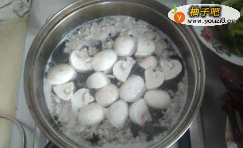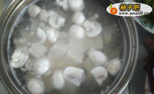 3加入鲜蘑菇块,加盖煮开,如图: