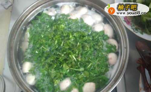 5加入荠菜,不加盖煮开,如图: