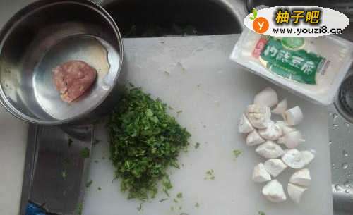荠菜洗干净切碎,鲜蘑菇洗干净切块,少量肉糜和一盒豆腐备用,如图: