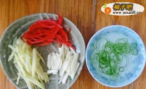 2腌鱼的时间,我们来切点姜丝和蒜头丝,红辣椒丝和葱丝如果觉得自己切的不够细的话,就直接切成辣椒圈和葱花也可以。