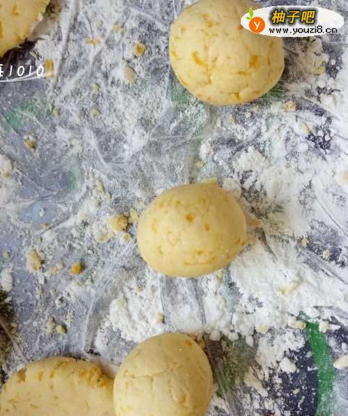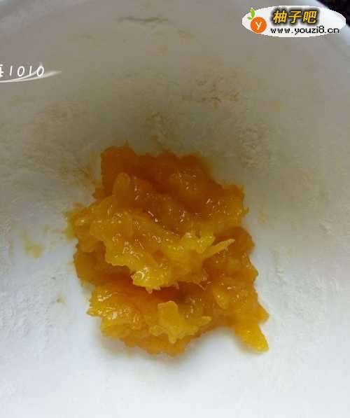 3压成泥的南瓜,取适量与糯米粉混合,揉成面团;