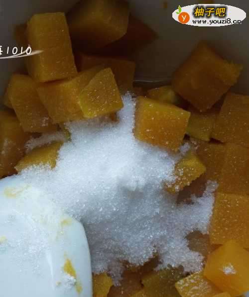 2南瓜丁趁热加入白糖,如果你的南瓜够甜或是你不喜欢太甜的,可以不加糖的;