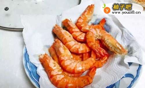 4虾炸至外壳转红色即可捞起,用厨房纸吸一罩眠墨下油