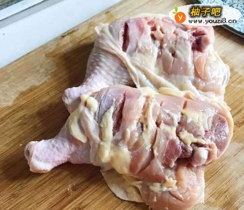 2接着将鸡腿洗净,用刀背拍打松弛,肉厚的地方切上几刀,这样有可以让鸡腿肉更入味!