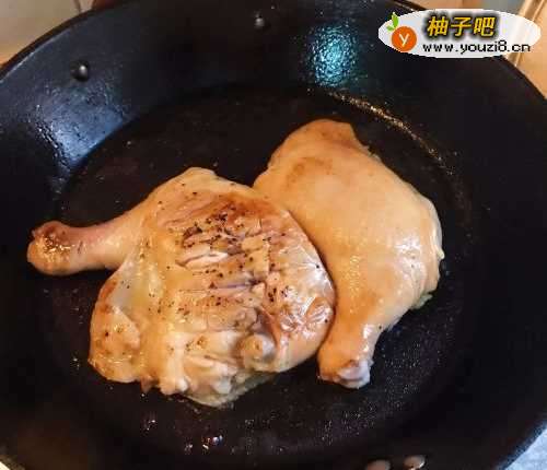 4腌渍好的鸡腿即可拿出来用平底锅开小火两面各煎1分钟左右。