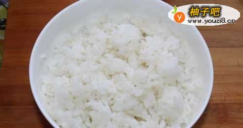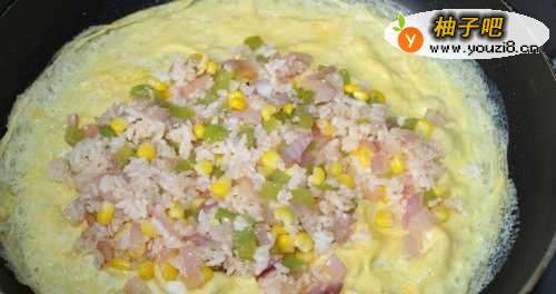 8如图将炒好的米饭放入包起来。