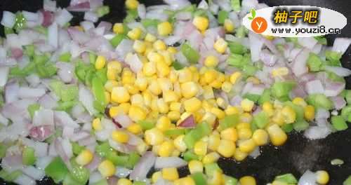 4然后放入玉米粒翻炒。