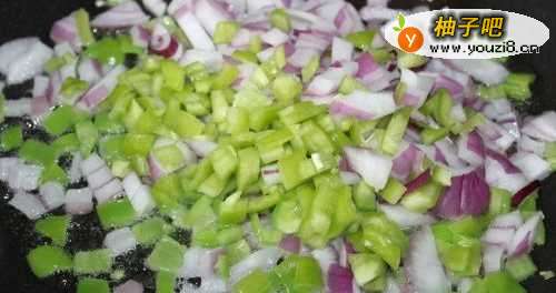 3锅中放油烧热,放入洋葱和辣椒翻炒至断生。