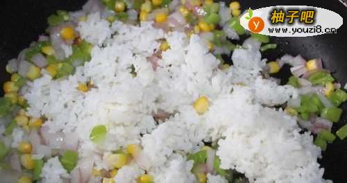 5放入米饭,然后放入盐。