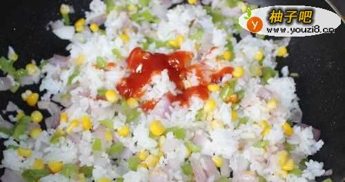 6将米饭炒散后,放入番茄酱翻炒均匀盛出备用。
