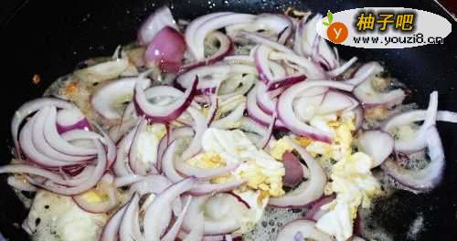 4鸡蛋炒好后,放入洋葱翻炒至断生。