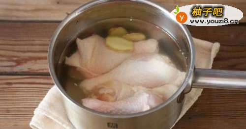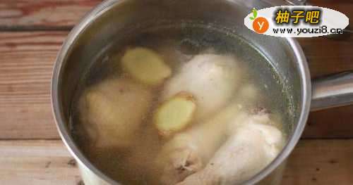 鸡腿与冷水一起进煮锅,放进1小块生姜,加入黄酒,大火煮开后转小火