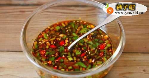 6接着调入文中材料里的生抽、香醋、花椒油、辣椒油、香油、白糖,调匀,料汁即成