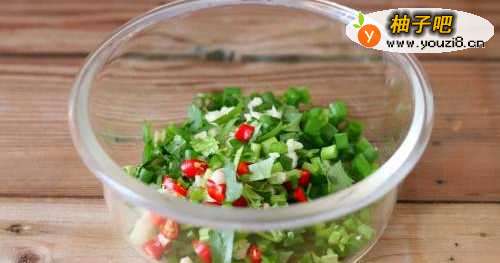 5在鸡腿冷却的过程中,把香葱、香菜、小米辣、生蒜都切碎,放进碗中