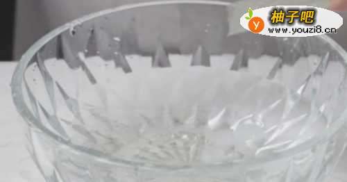 一 . 准备好一碗冰水,把吉利丁片剪成小块放入冰水中泡软,待用。(如图所示)