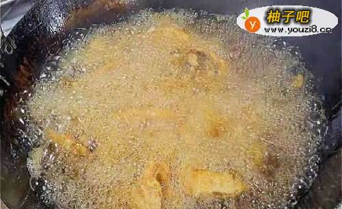4起油锅,将鱼肉放下去炸至金黄酥脆,取出沥油,放入磁盘中。