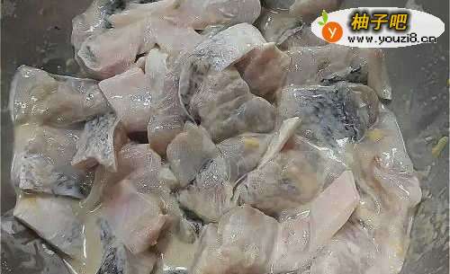 鲈鱼片出鱼肉切成条状,用米酒先腌一下,裹上太白粉。